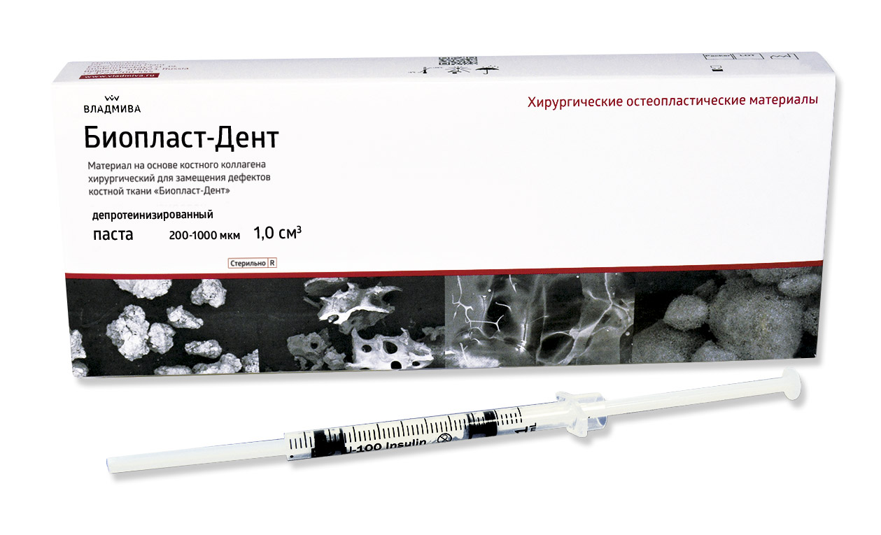 Паста «Биопласт-Дент» (депротеинизированный) представляет собой смесь, состоящую из увлажненных гранул кортикально-губчатой кости с размером гранул до 300 мкм и 200-1000 мкм.
