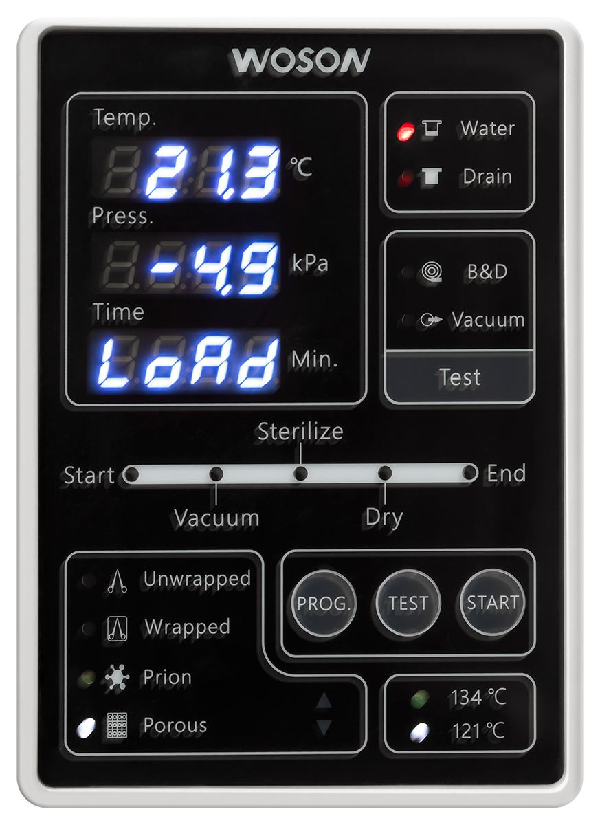 TANZO C23 оснащен компьютерным управлением с яркой цифровой индикацией. Модульная панель очень удобна в применении и отображает параметры процесса стерилизации. Если возникает ошибка, аппарат сообщит об этом. Тестовая программа BOWIE&DICK измеряет проникновение водяного пара. Для входа в режим теста удерживайте кнопку Package («упаковка») в течение 8 секунд, затем нажмите кнопку START.