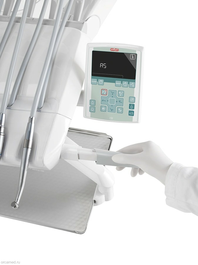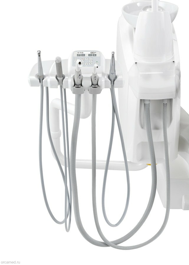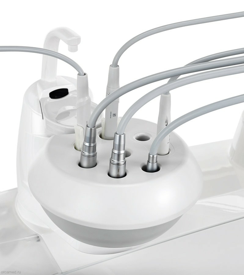 Режим ОРТО: Модуль для кресла с чашей- плевательницей доступен с 4 или 5 держателями и позволяет разместить в держателях, помимо 2 отсасывающих канюль, до 2 динамических инструментов (на выбор: скалер, электрический индукционный микромотор или турбина). Удобный дисплей со стеклянной защитой, облегчающий санитарную обработку, дополняет модуль, позволяющий врачам-стоматологам контролировать ключевые настройки каждого отдельного инструмента.
