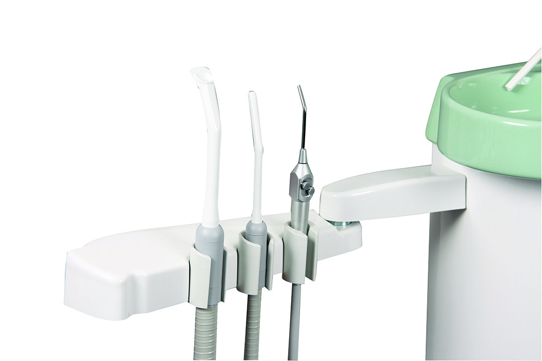 Столик врача расположен на жестком поворотном плече, с нижним ведением шлангов, на 5 инструментов. В базовой комплектации установлено 3 инструмента: